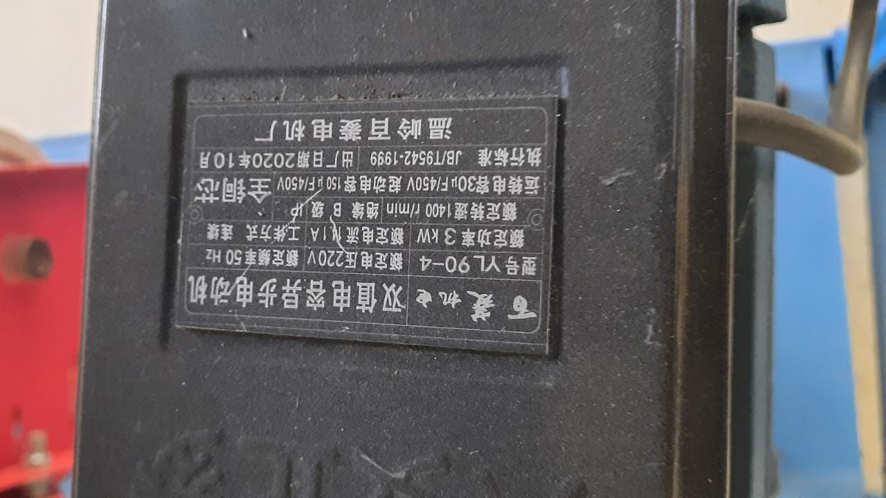 modlo YL90-4, Tension nomial 220V, Frecuencia nominal 50 Hz, Potencia nominal 3 KW, Corriente nominal 1A modos de trabajo. Velocidad nominal 1400 r/min clase de aislamiento B IP, Condensador de funcionamiento 30uF/450V Condensador de arranque 150f/450v.